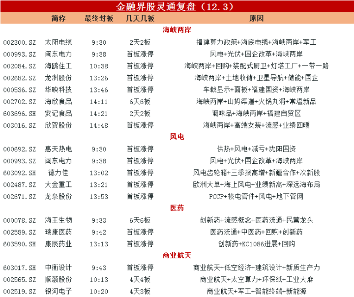 海峡两岸概念逆势活跃,太阳电缆等涨停。商业航天概念仍维持一定热度,银河电子等涨停。风电板块拉升,大金重工等涨停。